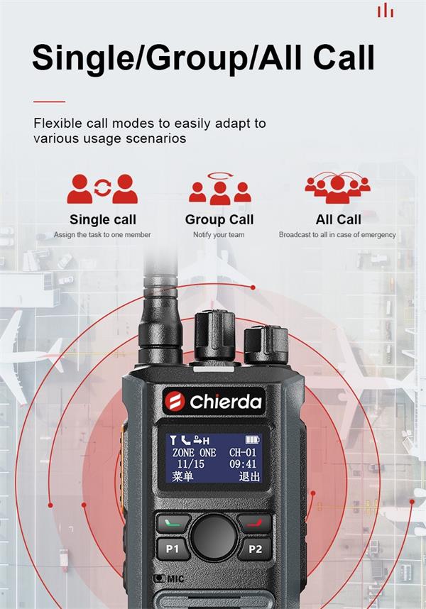 DP300 radio has 3 flexbile call modes, single call, group call, and all call. Single call can talk to one person. Group call can notify the whole group at a time; and All call can broadcast. By doing so, using different call modes can reduce radio traffic and ensure critical messages reach the right people