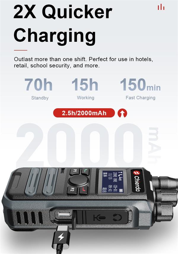 DP300 radio is equipped with a 2000mAh battery. The battery can outstand for 15 hours of working. With Type-C compatibility, it only takes 150 minutes to fully charge the radio.