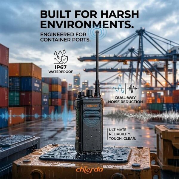 Chierda TC368 is a 10W high output power handheld radio. The strong signal easily penetrates thick walls and metal structures. It is waterproof and dustproof, which can be use in harsh environments. It features an advanced noise-cancelling function.