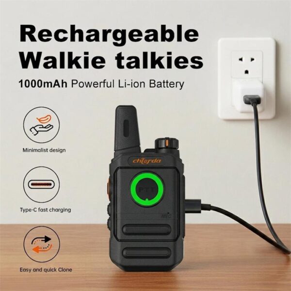 Walkie talkie kecil Chierda TC28 memiliki keseimbangan sempurna antara fungsionalitas dan keterjangkauan. Walkie talkie ini memiliki desain yang ramping dan ringan. Indikator napas berbentuk cincin di bagian depan dapat berubah menjadi hijau dan merah saat mengirim dan menerima sinyal. Pengoperasian yang sederhana dan mudah digunakan membuatnya ideal untuk digunakan di restoran dan bar, serta sebagai hadiah untuk anak-anak.