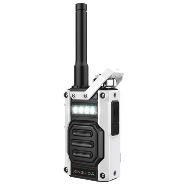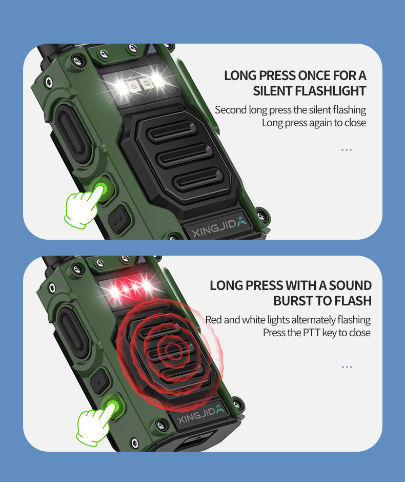 Press and hold PF1 to turn on the flashlight, and a beam of white light will appear on the front of the walkie-talkie. Press and hold PF2 to alternate between red and white. In an emergency, you can send a signal to rescuers.